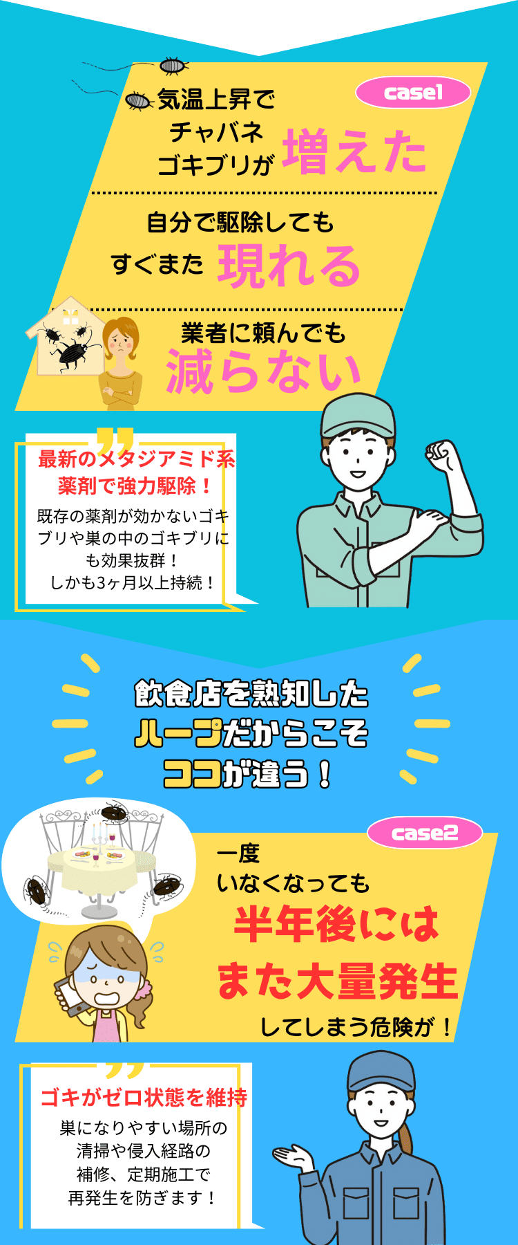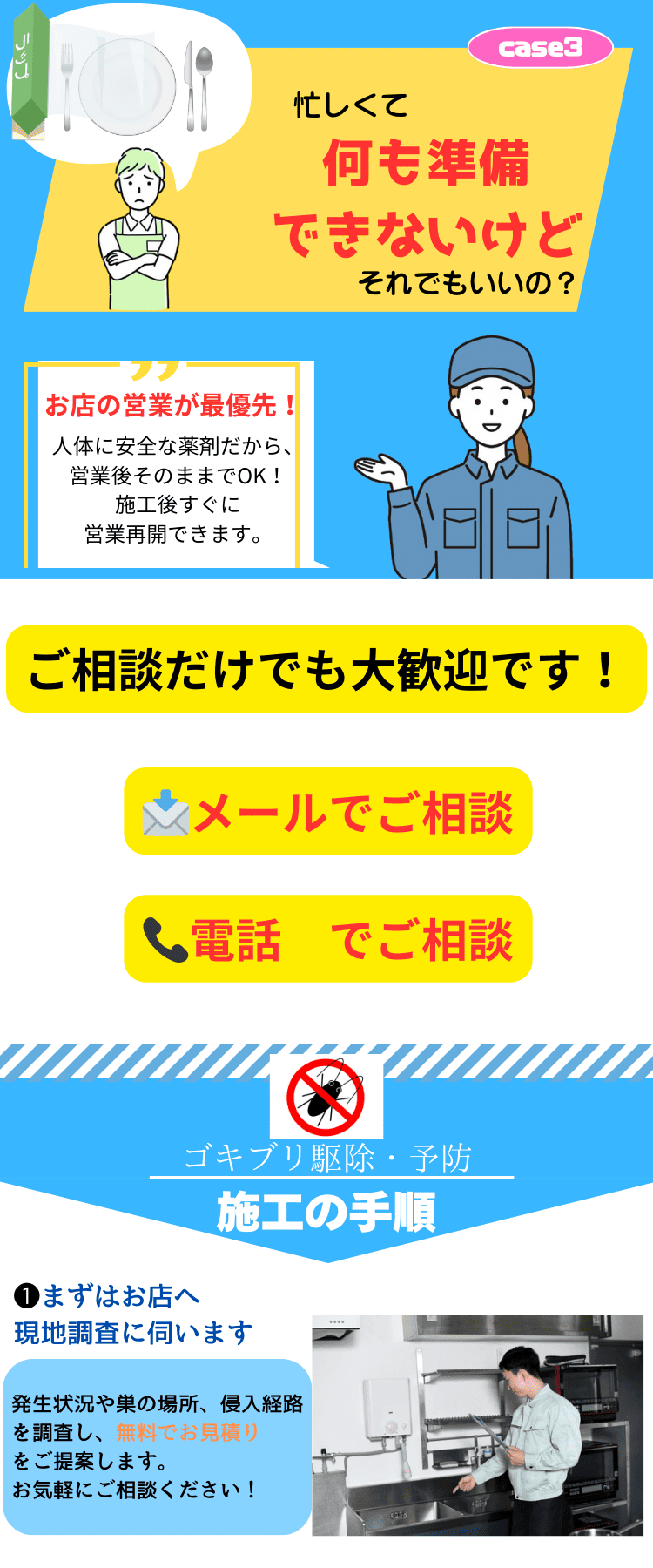 ゴキブリが出た時、市販のスプレーやくん煙剤で何とかしようと思うかもしれません。しかし、飲食店でこれらを使うのは非常に危険です!特に、チャバネゴキブリは厨房で繁殖しやすく、駆除が不十分だと、生き残ったゴキブリが客席に逃げ込み、そこで新たに繁殖してしまう恐れがあります。もしお客様にゴキブリを目撃されてしまったら、信頼を失いかねない最悪の事態です。ゴキブリが出た時は、必ずプロに依頼して徹底的に駆除し、安心できる環境を維持することが重要です。